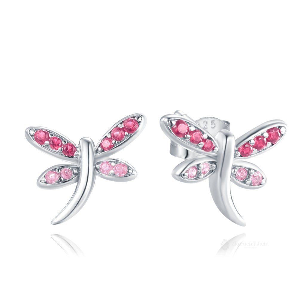 MINET Stříbrné náušnice vážky se světle a tmavě růžovými zirkony