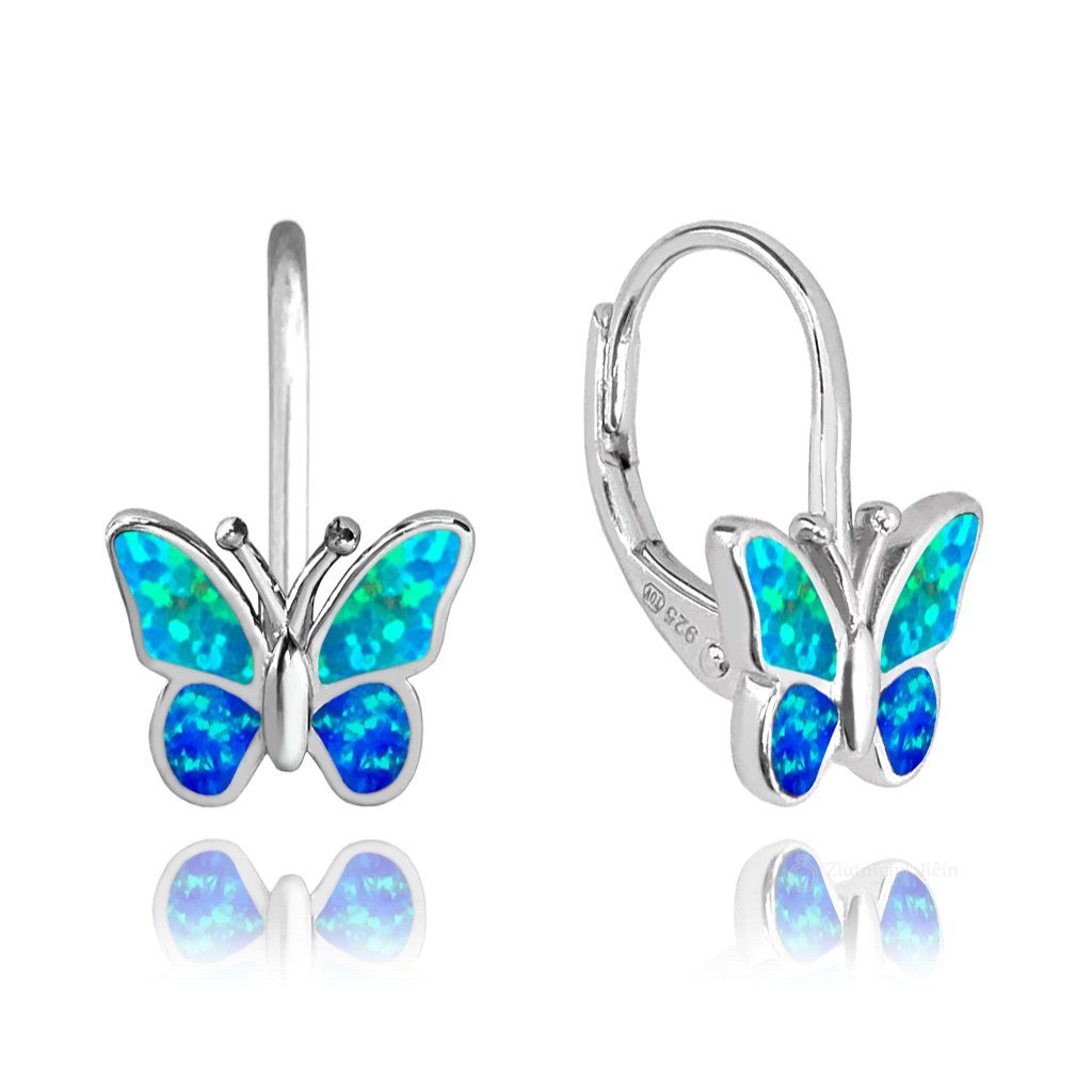 MINET Třpytivé dětské stříbrné náušnice MOTÝLCI s modrým opálem