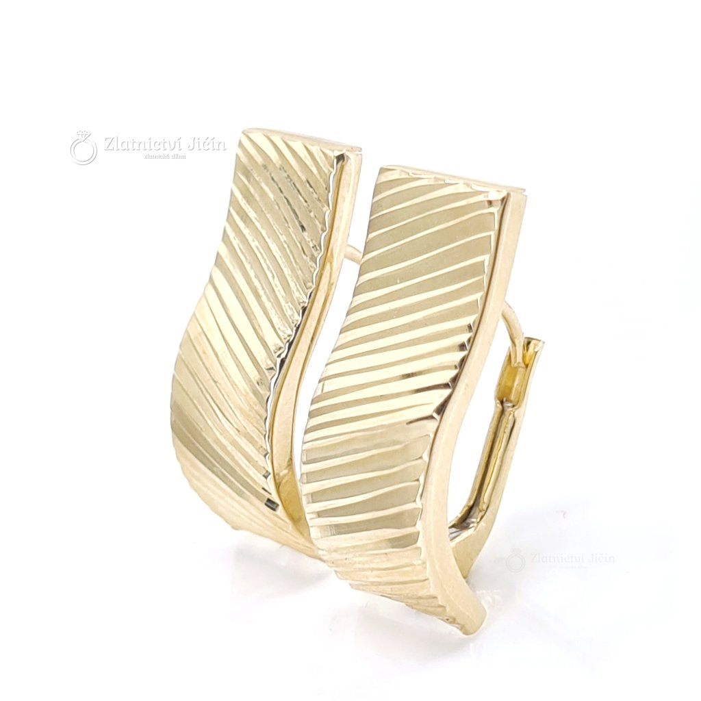 Gravírované náušnice ze žlutého zlata ryzosti 14 karátů (585/1000) na klapku. Háček je přiletovaný o dost níže než je obvyklé, náušnice tedy hezky překryjí dírky a přilehnou k uchu.