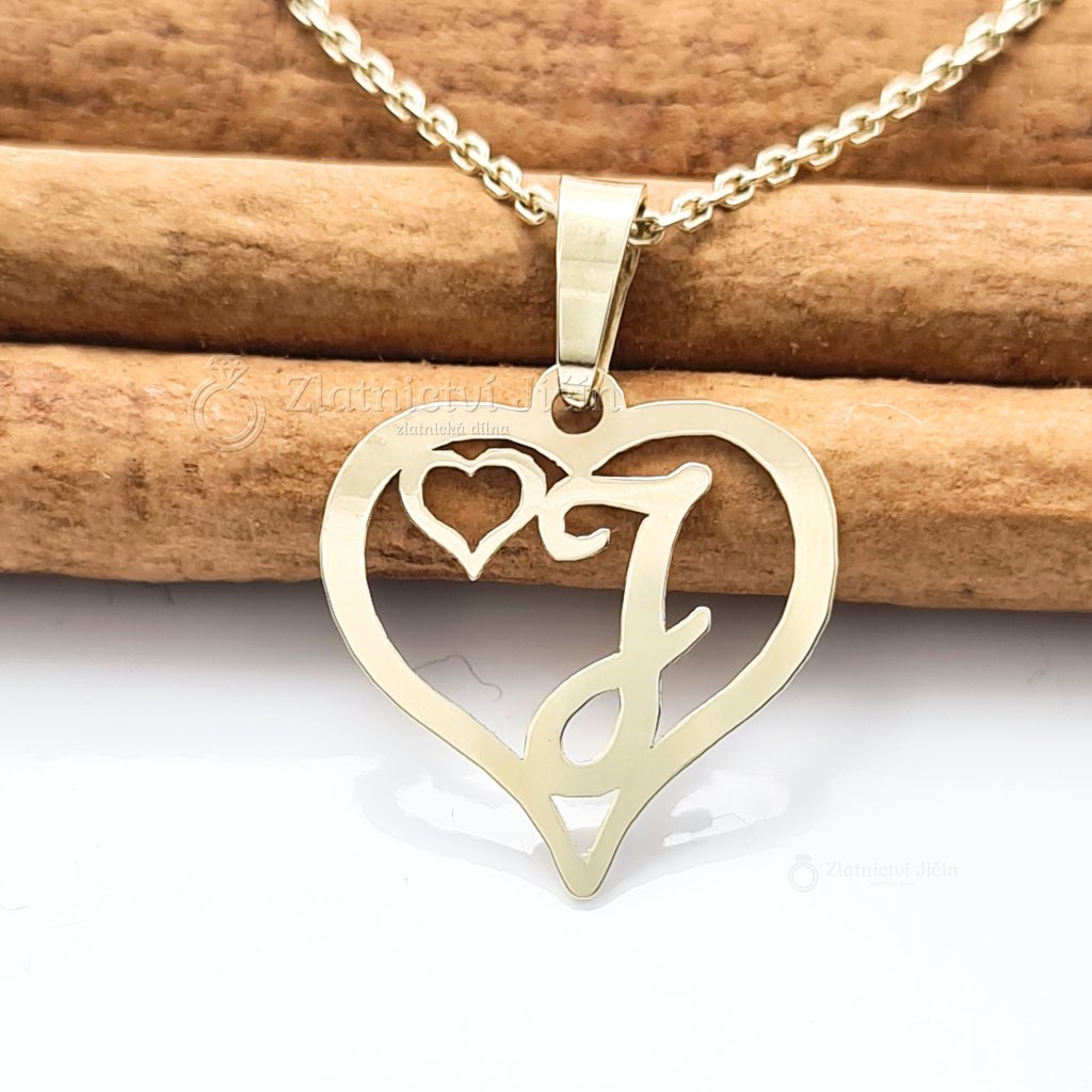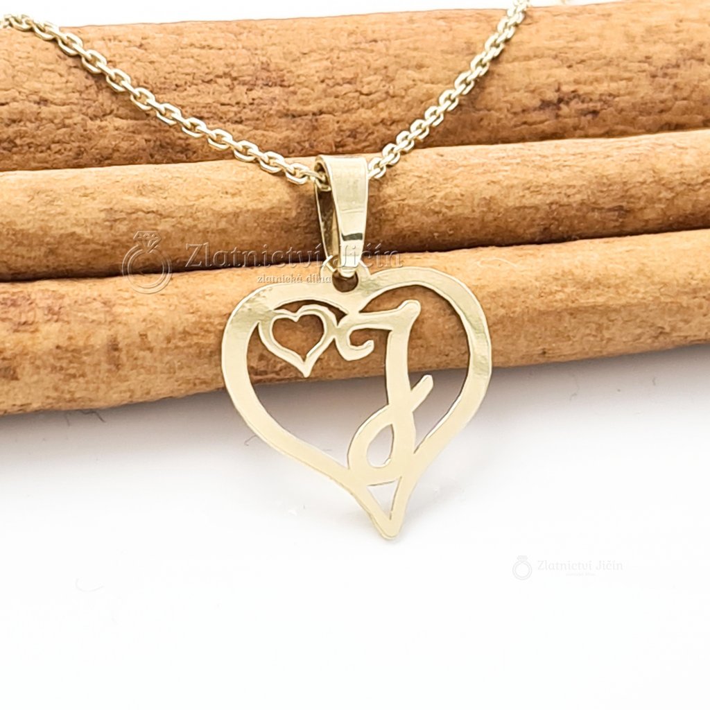 Přívěsek ve tvaru srdíčka, ve kterém se skrývá ještě jedno malé srdíčko a psací písmeno J.