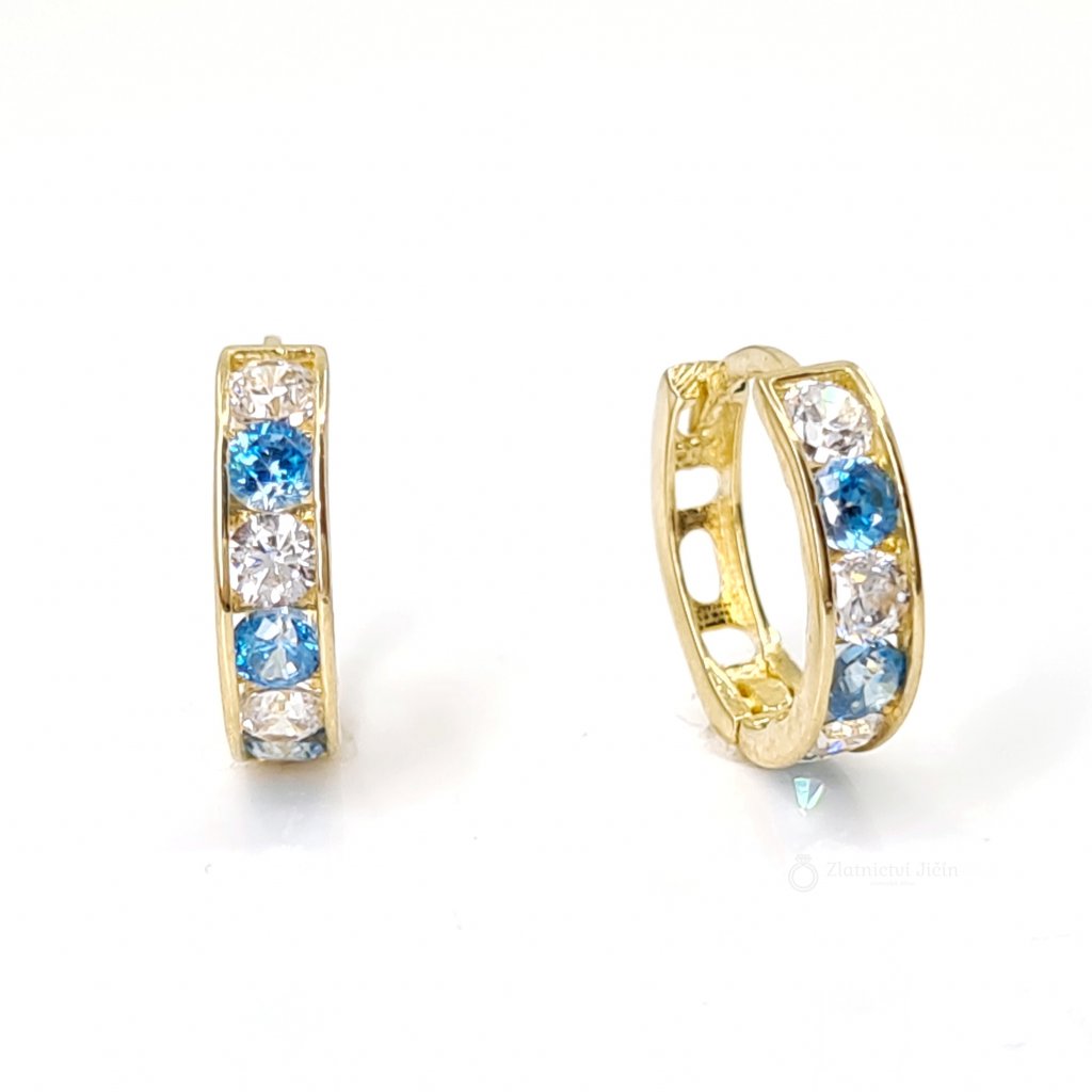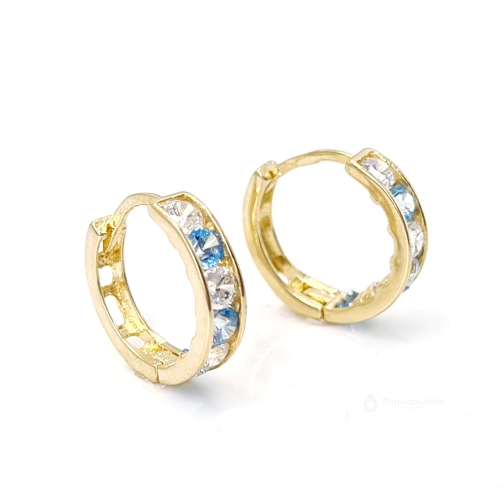 Stylové náušnice se světle modrými a bílými syntetickými kamínky vyrobené ze 14 karátového žlutého zlata ve tvaru kruhu o průměru 9,5 mm.