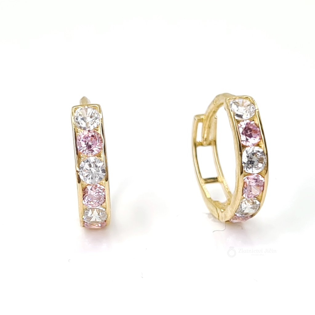 Tyto klasické dámské náušnice - kroužky, jsou z poloviny obvodu doplněny zářivými bílými a růžovými zirkony.