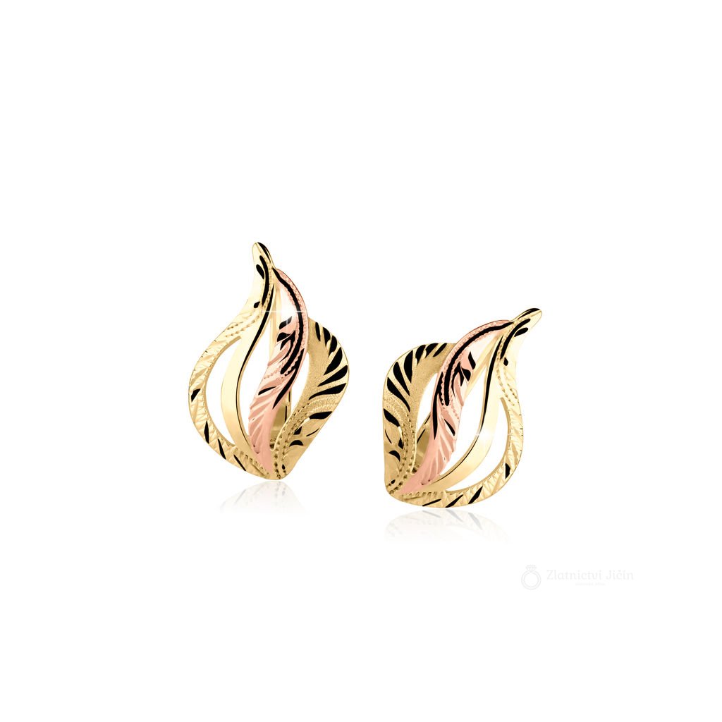 Gravírované náušnice jsou vyrobeny ze žlutého a červeného 14 karátového zlata.