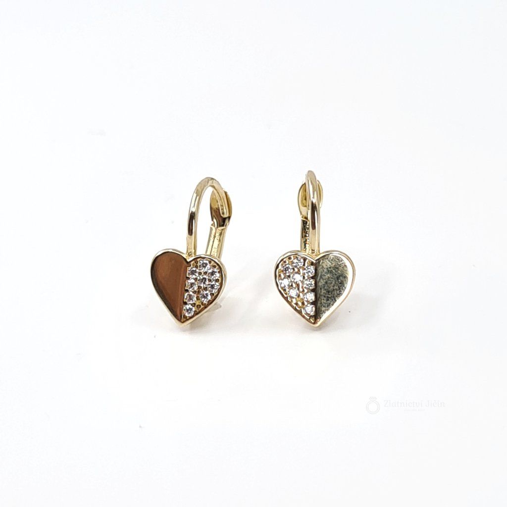 Zlaté náušnice ve tvaru srdíček vyskládané z poloviny zirkony jsou vhodné jako druhé náušnice pro dívky.