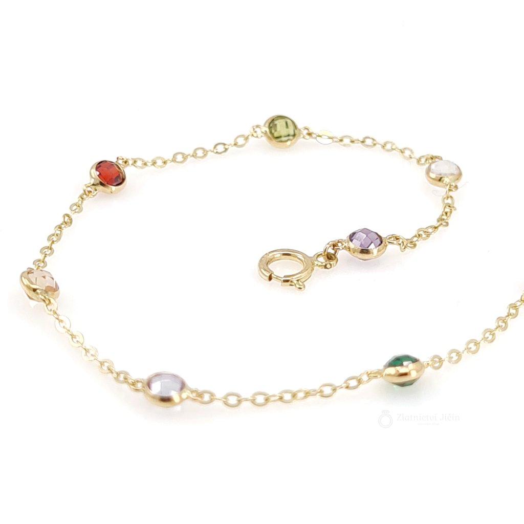 Elegantní jemný náramek, který Vás okouzlí již z dálky. Náramek je vyroben ze žlutého zlata o ryzosti 585/1000 (14kt) a doplněn o barevné broušené kameny. Jeho váha je 1,32 g. Délka náramku je 19 cm.