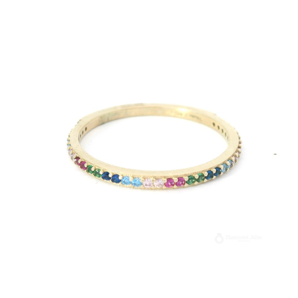 Nádherný prsten ze 14k žlutého zlata zdoben barevnými syntetickými kameny. Prsten o velikosti 53.