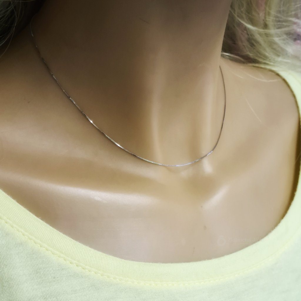 Jemný řetízek typu venezia (kostičky) ze 14k bílého zlata. Rhodiováno.